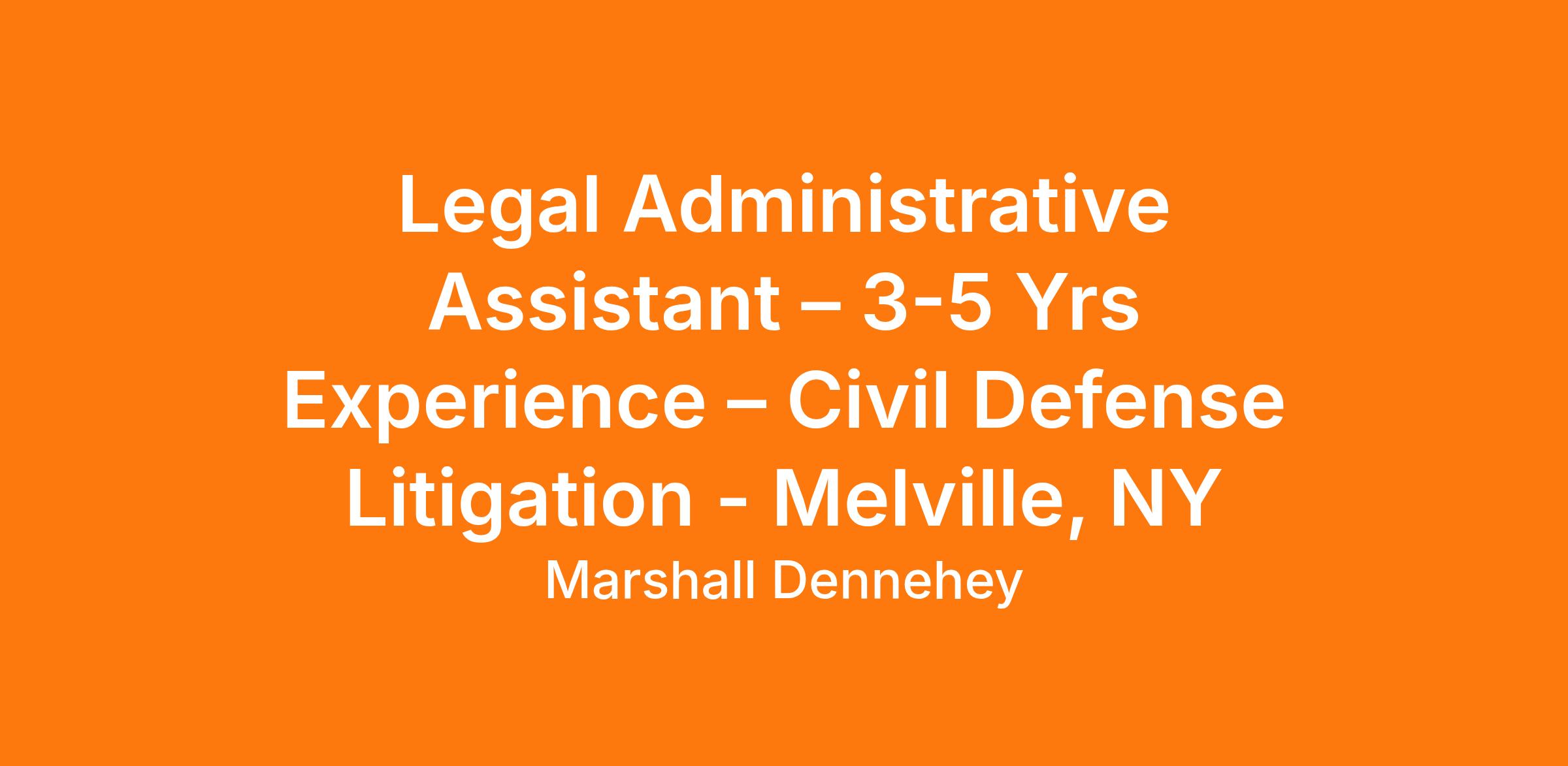 The law firm of Marshall Dennehey seeks a full-time Legal Administrative Assistant with 3-5 years of civil defense litigation experience to join its Melville, NY office.